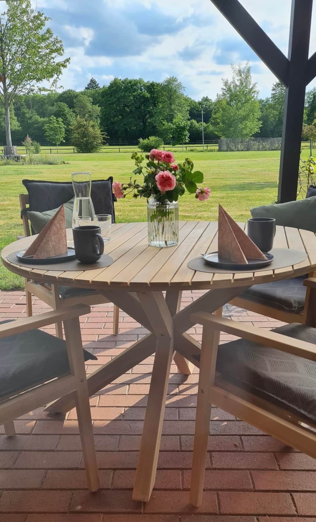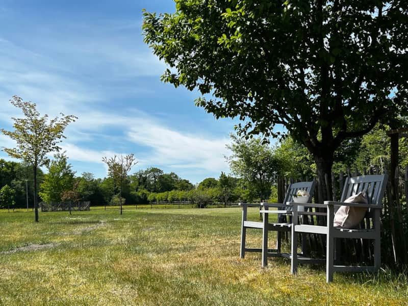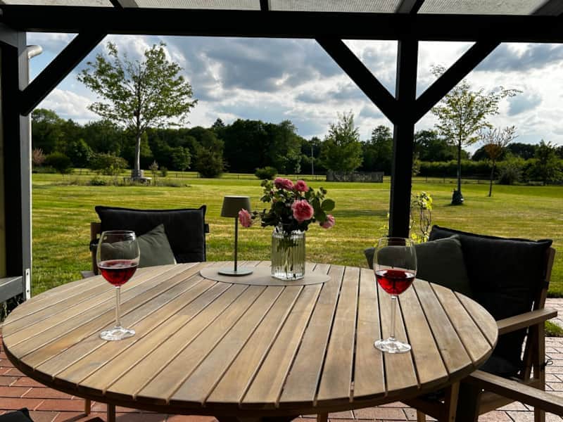 Ein echtes Highlight ist die ruhige Terrasse mit Blick in den Garten und auf die angrenzende Weide und den dahinter liegenden Wald – ein idealer Ort zum Relaxen bei einem Glas Wein oder zum Frühstück im Grünen.